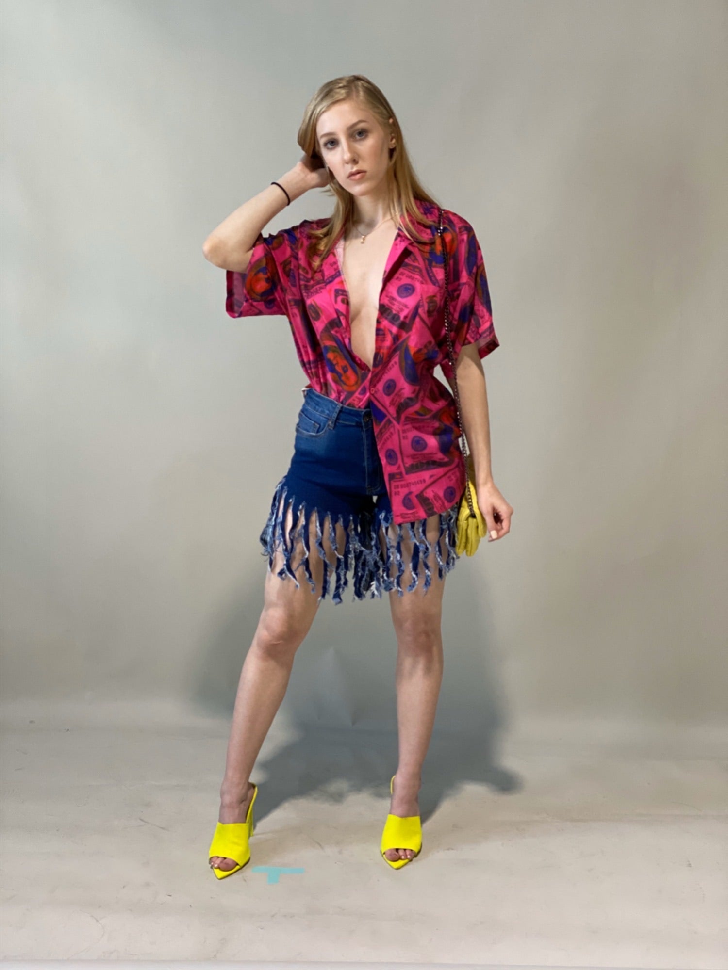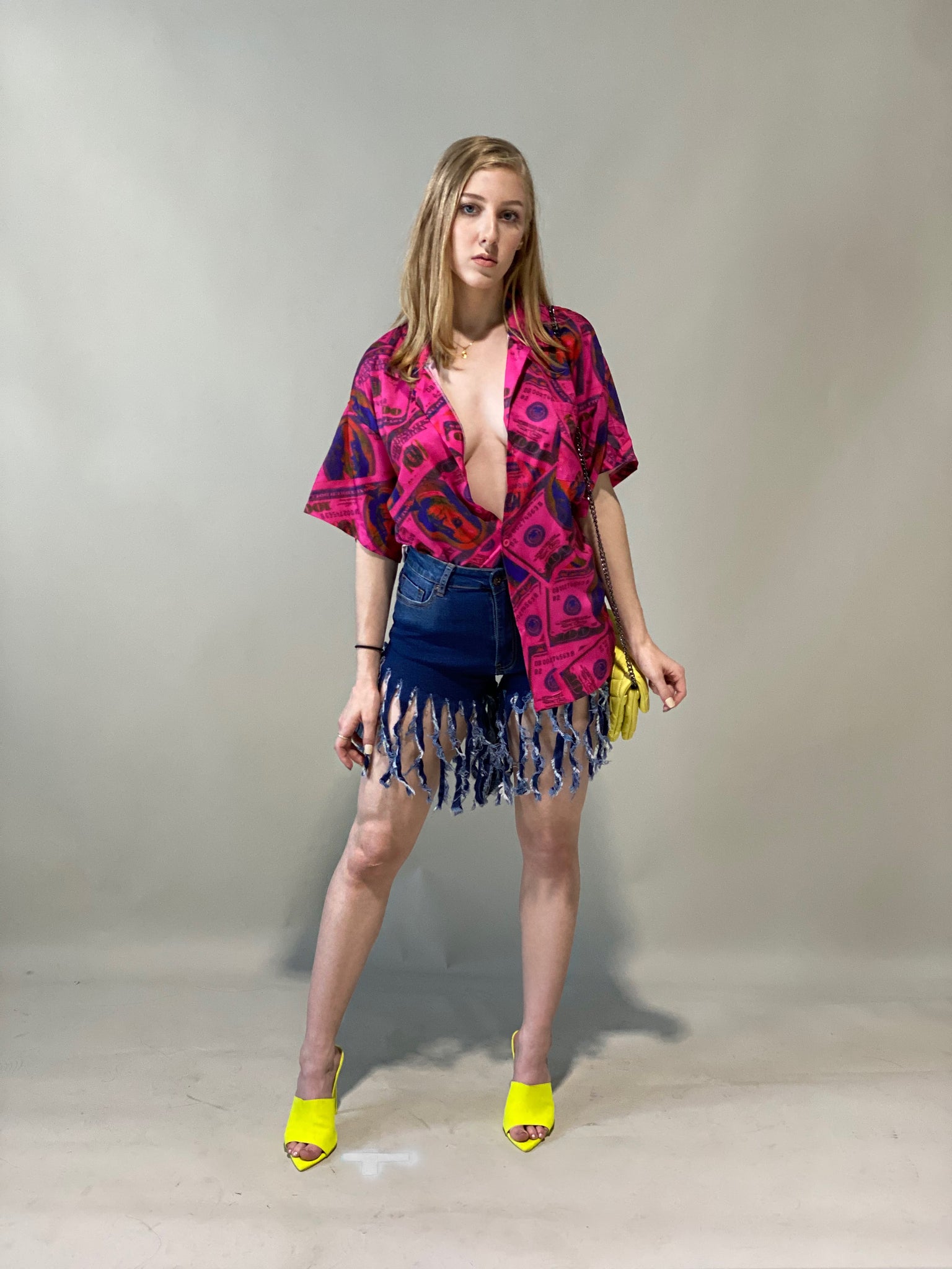 Blended colors of Pink, Purple, and specks of green . Money outlined in navy blue and black